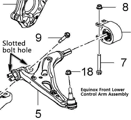 Сликата погоре го прикажува склопот на предната долна контролна рака за Chevrolet Equinox. Стрелката ја означува структурата на отворот со отворени завртки во склопот на черупка.