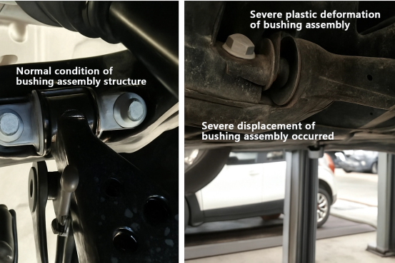Направена е споредба помеѓу нормално функционалниот склоп на черупка на контролната рака (како што е прикажано на долната лева слика) и неисправниот склоп на черупка (како што е прикажано на долната десна слика). Тој истакнува дека со споредување на левата и десната слика подолу, лесно е да се забележи дека празнината во нормалната черупка на контролната рака лево е униформа и не треба да има очигледно свиткување или деформација како што е прикажано на десната слика. Ако возилото ја покажува состојбата прикажана на десната слика, тоа веќе претставува безбедносна опасност за време на работата.